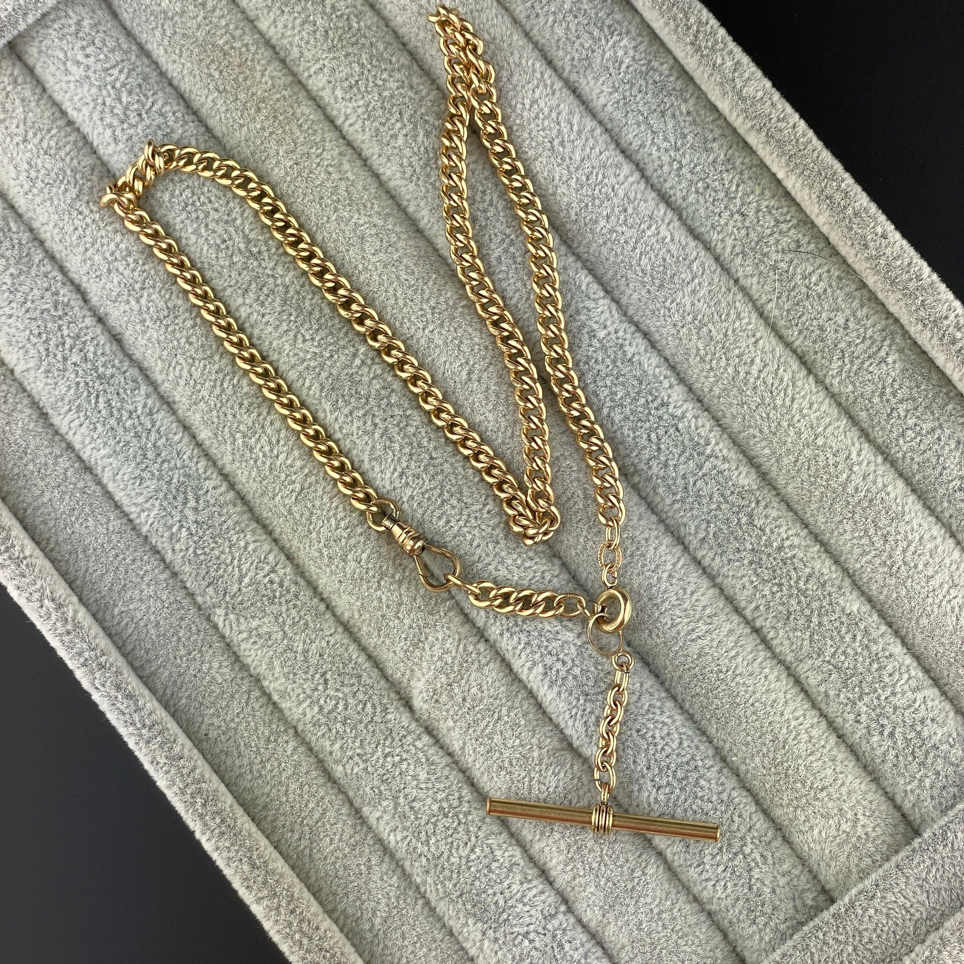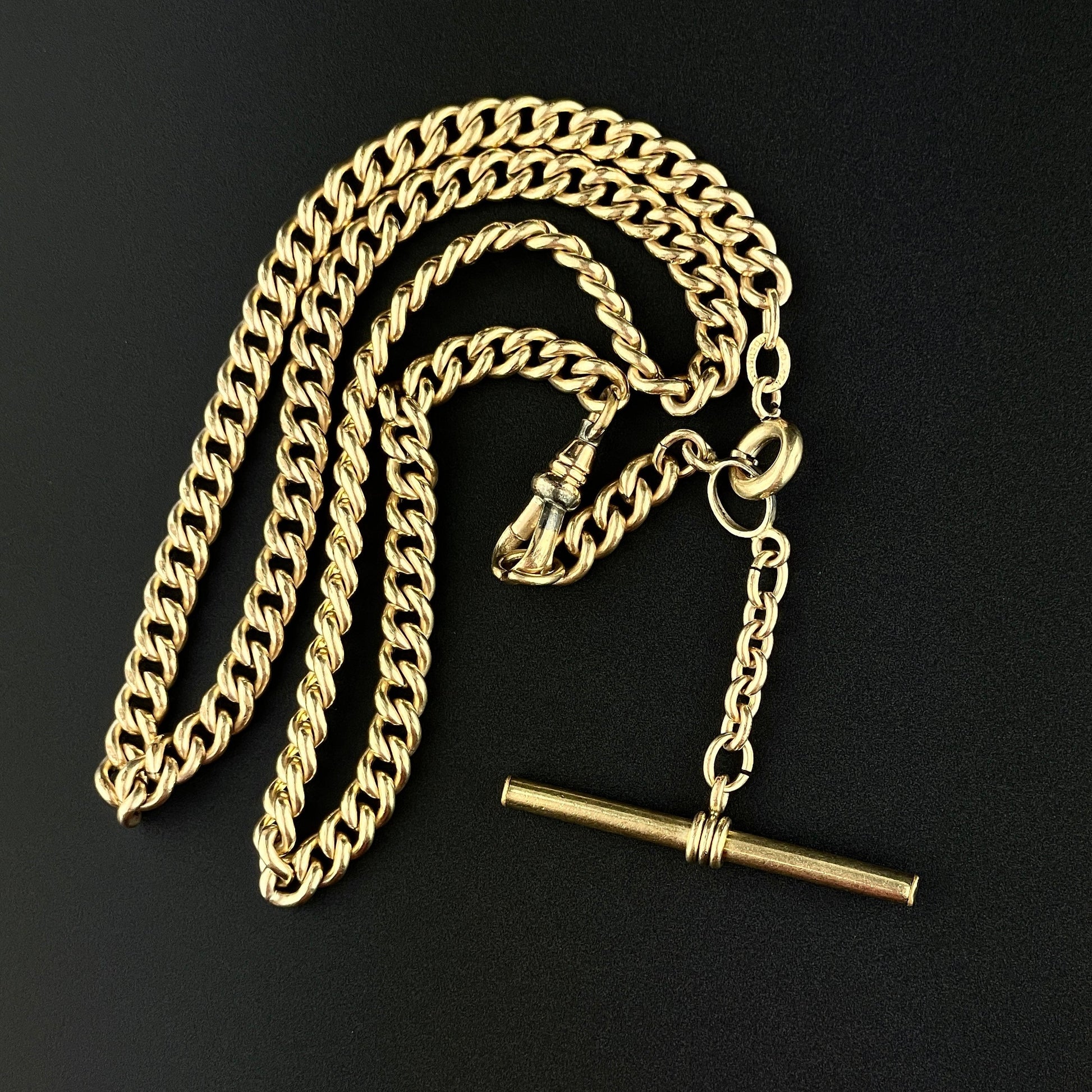 Very handsome antique Victorian double Albert pocket watch chain in a rich 12K rolled gold that can double as a necklace or bracelet. The graduated curb chain has a center t-bar and matching drop chain ready to add a fob with each end having a swivel dog clip. A striking Albert chain to wear with a pocket watch for the gents, wear as a necklace for the ladies, or wrap around your wrist for a unique look!