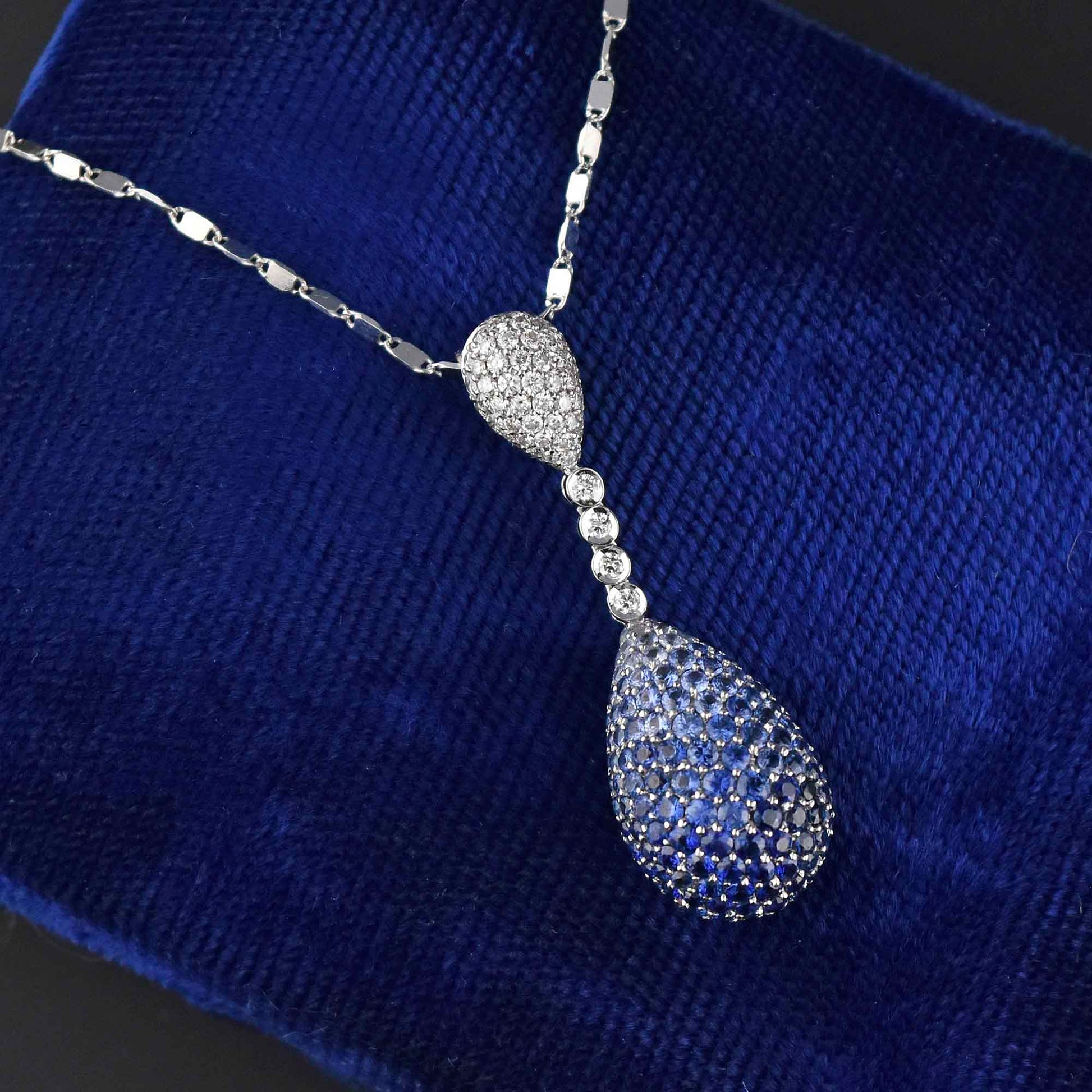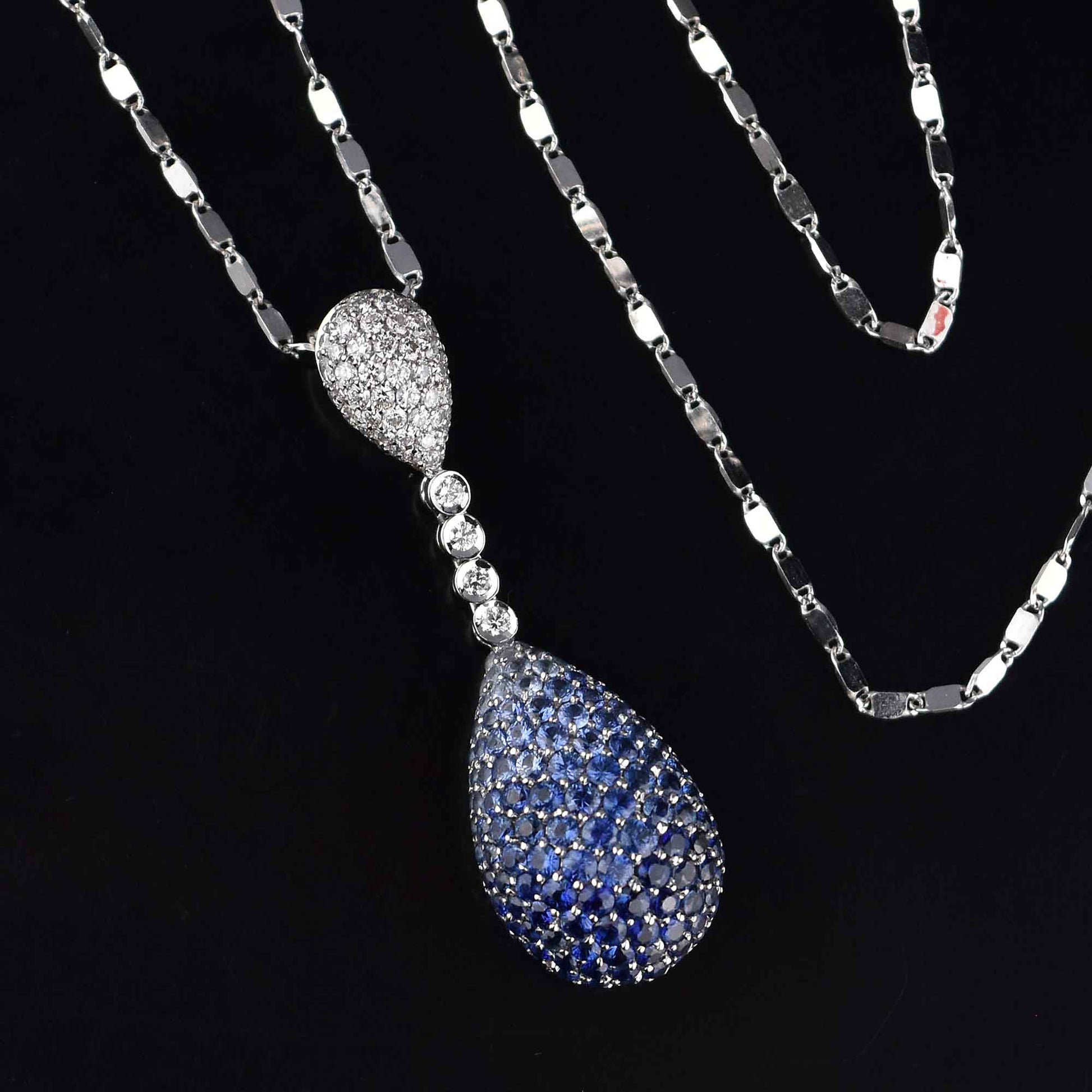 Exquisitely designed and hand-fabricated in 18K white gold, 6.5 carats of rich natural sapphires are pave set in this gorgeous vintage pendant. The bulbous teardrop pendant sways for a row of articulated diamonds connected to a diamond pave set top with the diamonds totaling .66 carats. The pendant is suspended from an 18K gold flat link chain. Simple, elegant classic one of a kind piece of jewelry that will be a lasting heirloom! This comes with a GIA Certificate.
