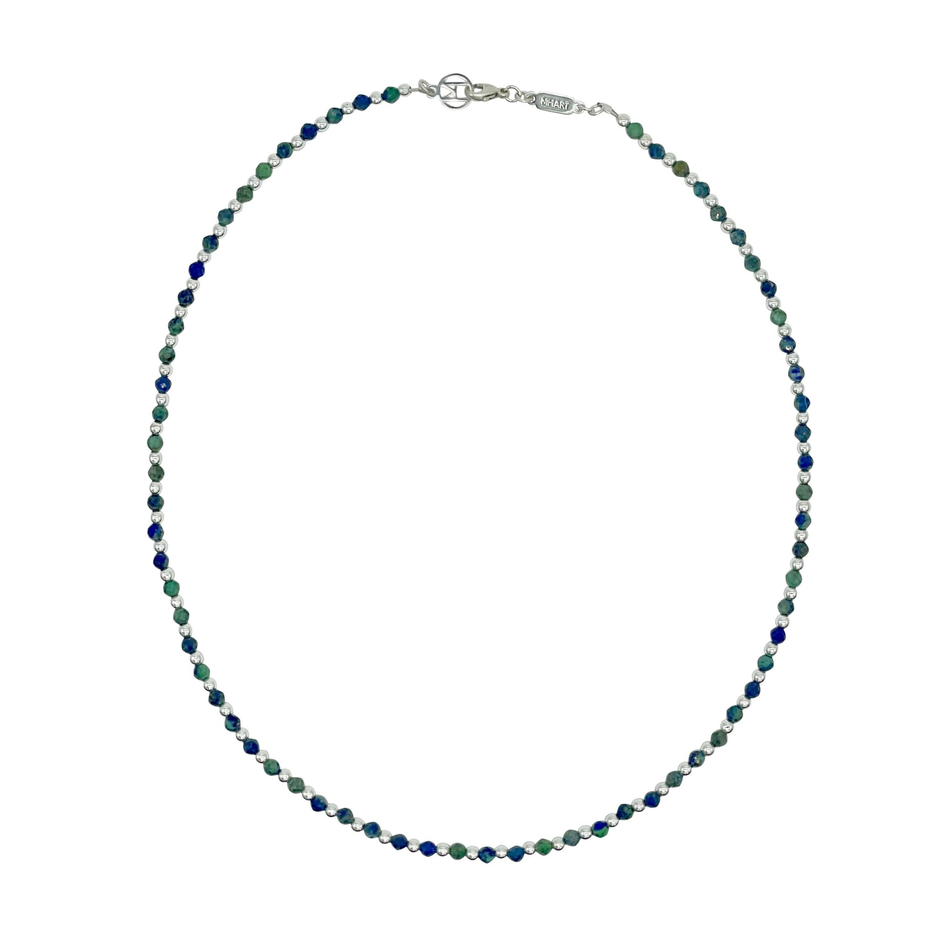 This necklace is handcrafted from african turquoise and sterling silver plated hematite gemstones and our MHART signature closure. Wear this piece as a solo statement or layered with other MHART necklaces.