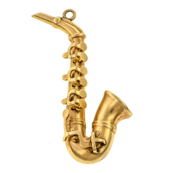 With moveable keys, fashioned in 14k yellow gold. Measuring approx. 1 1/2 x 5/8.