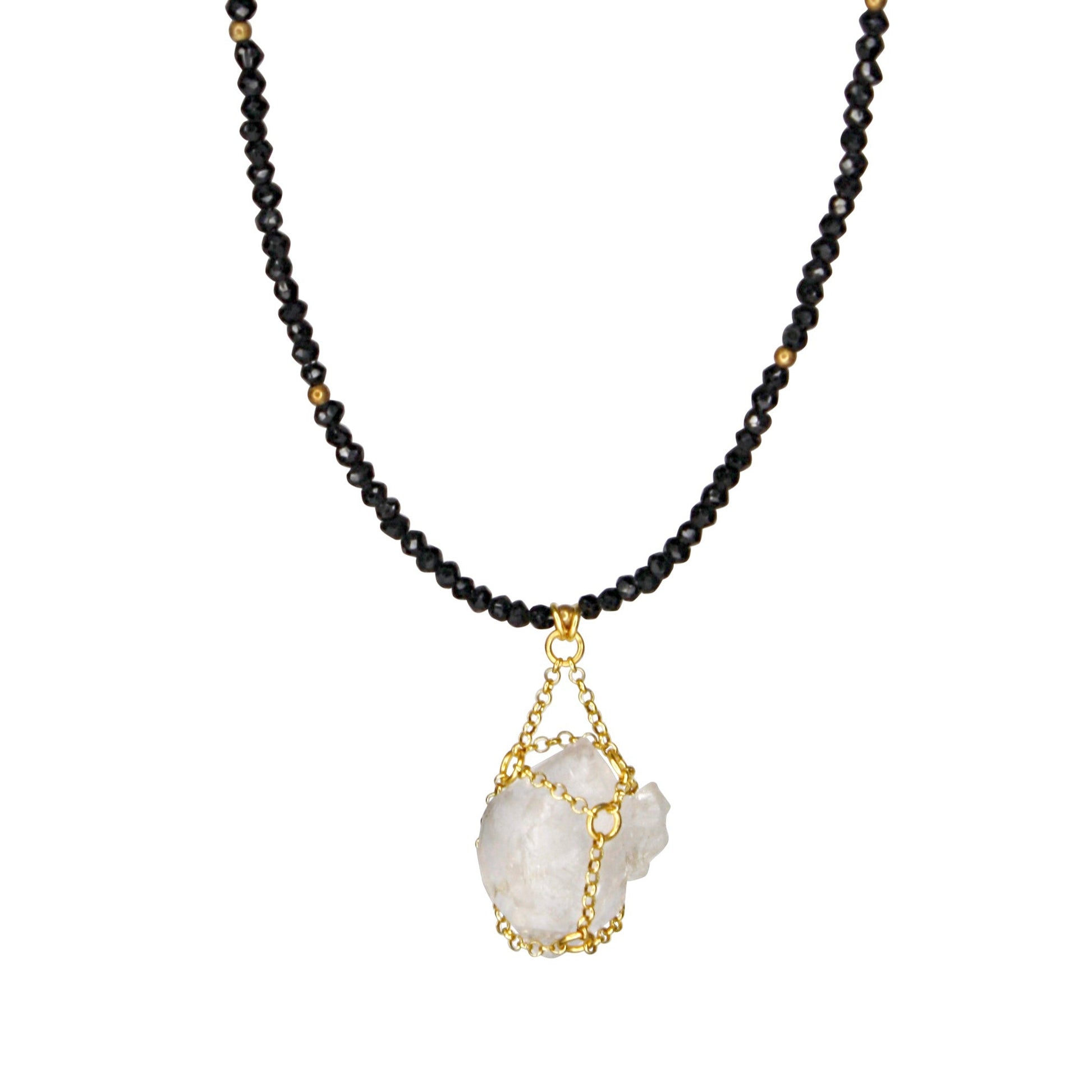 This necklace is handcrafted from a one-of-a-kind quartz gemstone caged in gold vermeil chain and faceted black spinel beads. This necklace can be layered or worn on its own, making it the perfect accessory for any occasion. This necklace can be worn long or double wrapped as a choker.?