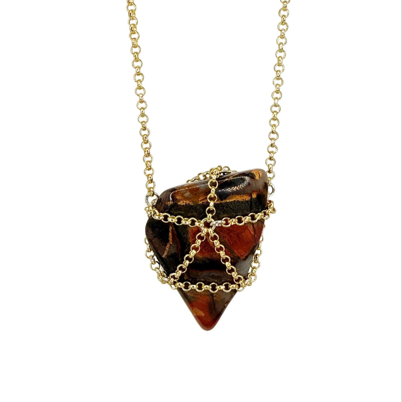 This necklace is handcrafted from a one-of-a-kind jasper gemstone caged in 14 k gold plated brass chain.