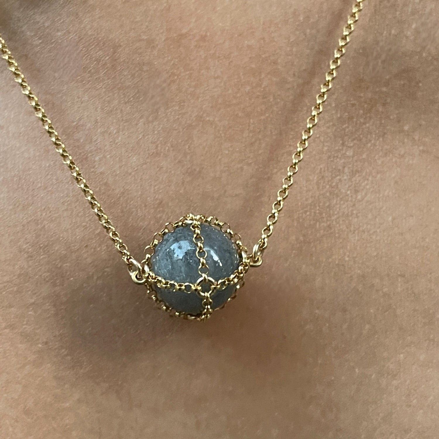 The Caged Labradorite Pendant is made of a one-of-a-kind labradorite gemstone and 14k gold vermeil.