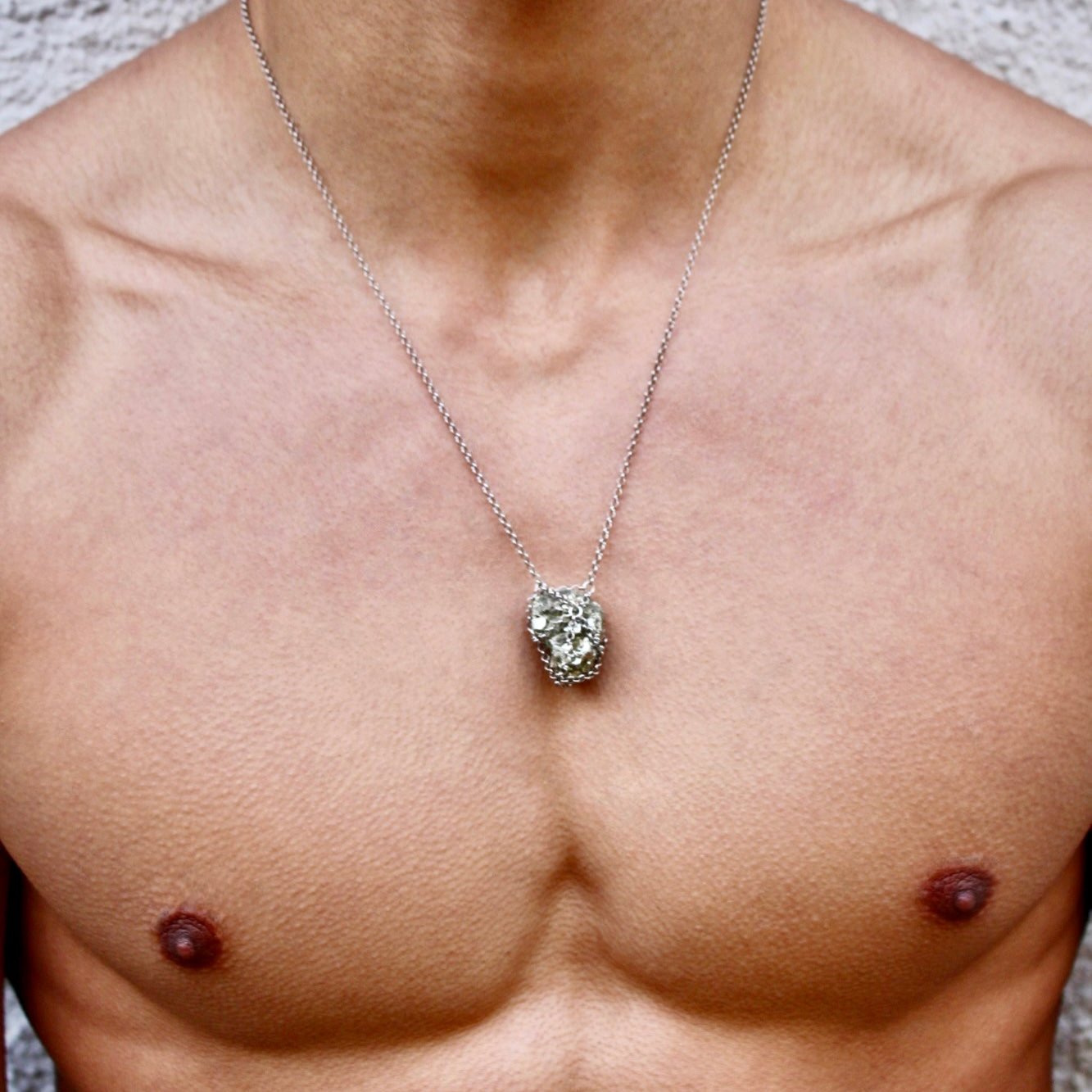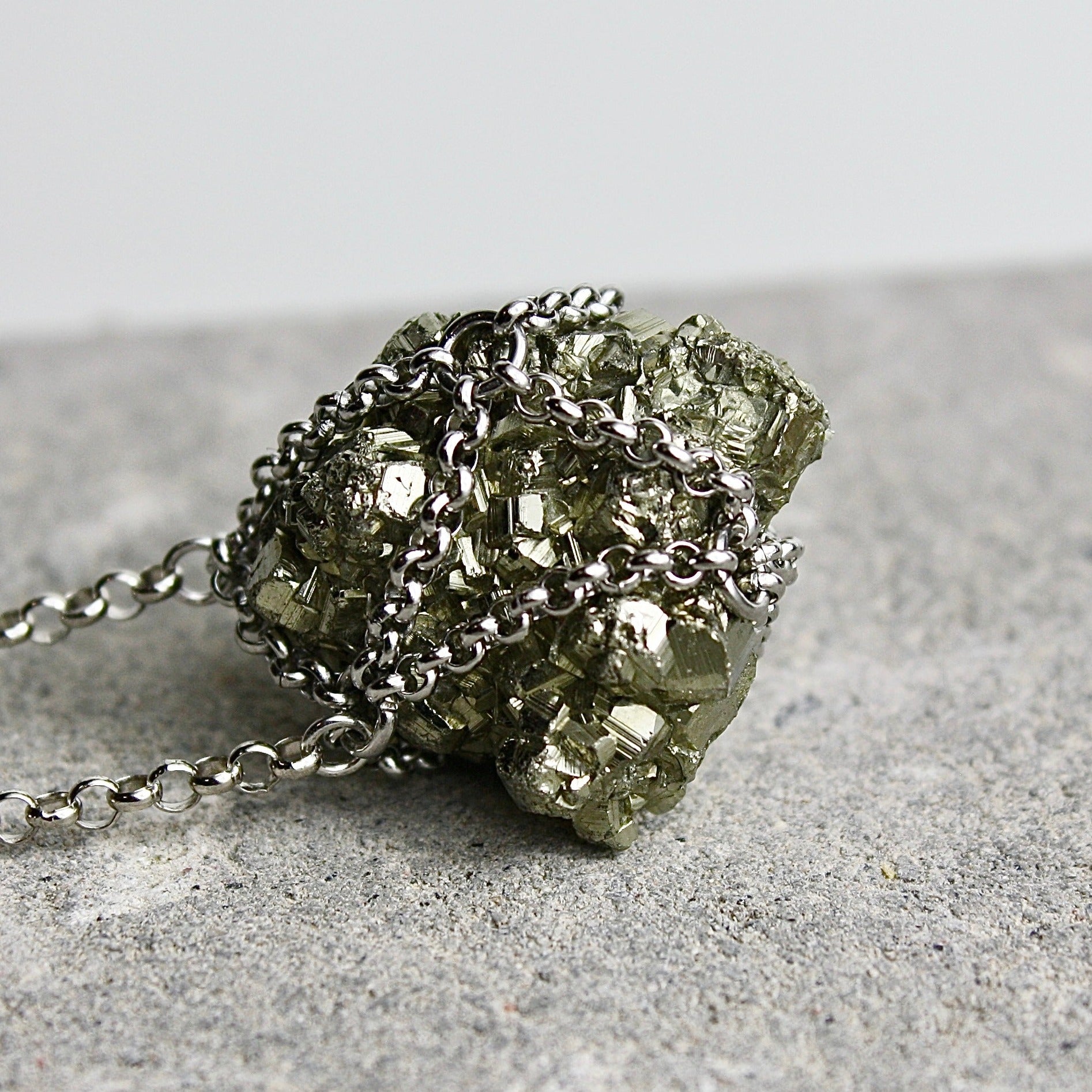 This one-of-a-kind pyrite gemstone is locked into a chain, mimicking the intricate web spun by spiders. The webbing is both elegant and eye-catching. This necklace showcases a unique gemstone that will capture everyone's attention.