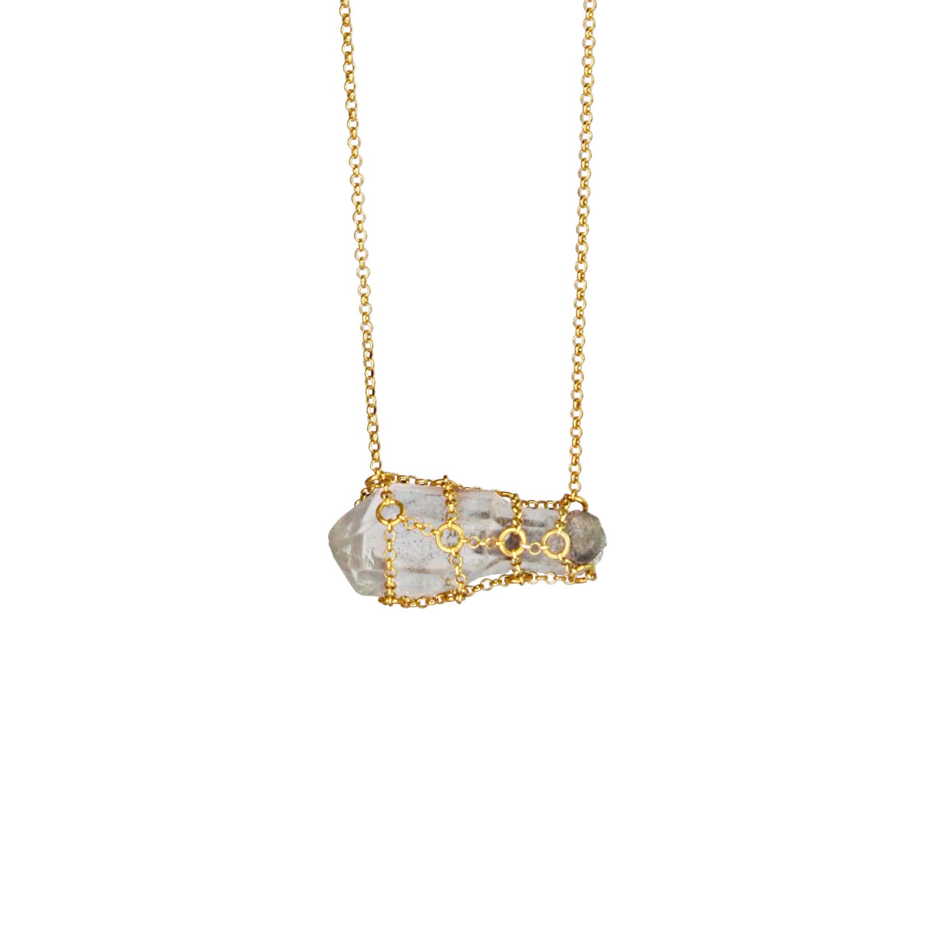This necklace is handcrafted from a one of a kind quartz cluster gemstone caged in gold vermeil chain. The gemstone is cut and polished to bring out its natural beauty, and then set in a delicate gold cage. The result is a stunning piece of jewelry that is truly unique.