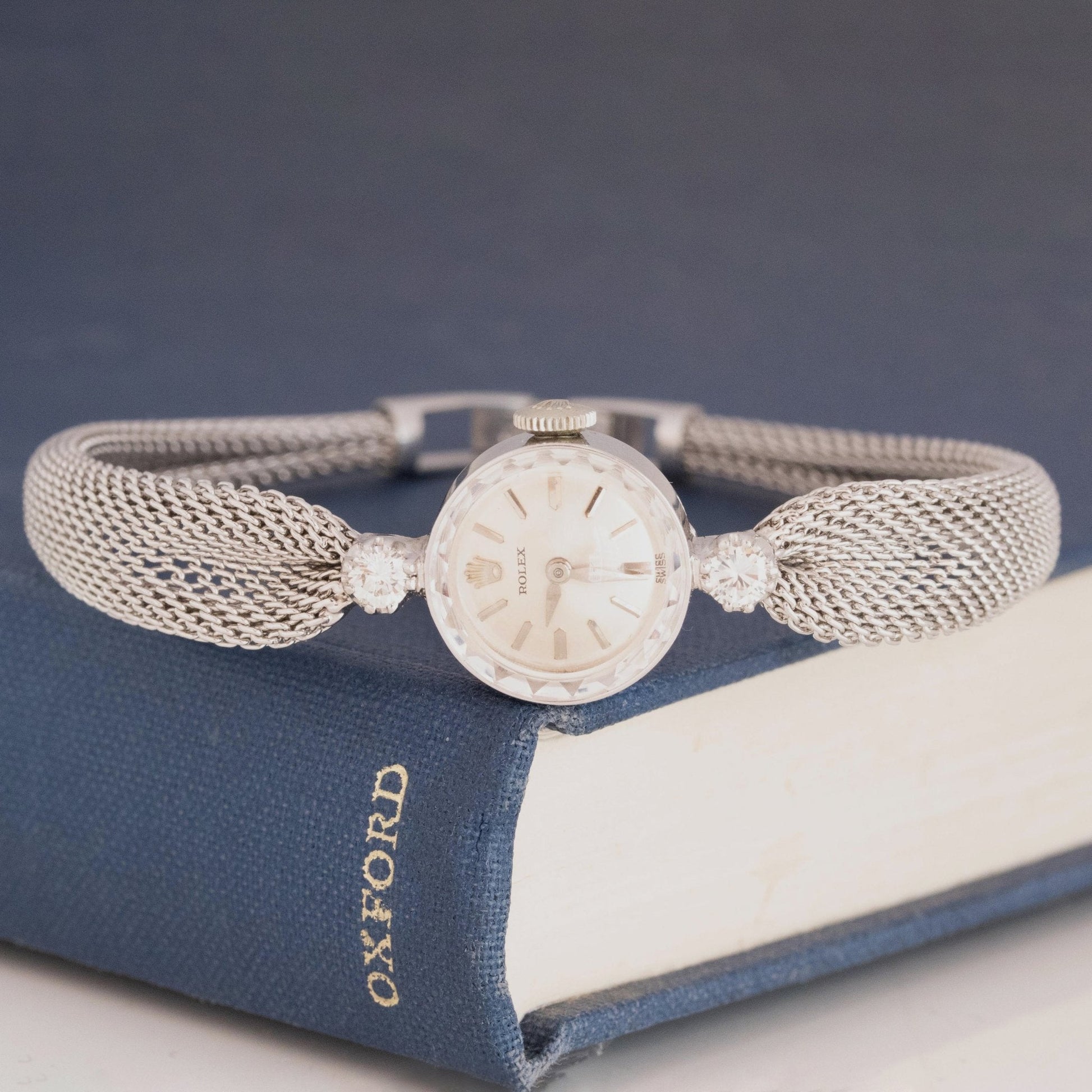 Looking for the perfect demure dress watch? This circa 1970s model by Rolex is perfect - the ribbon mesh bracelet, the criss-cross diamond pattern of diamonds, and that delicate 15mm case brings the whole package. An of course, its a Rolex to boot! Subtle patina only adds to the charm.