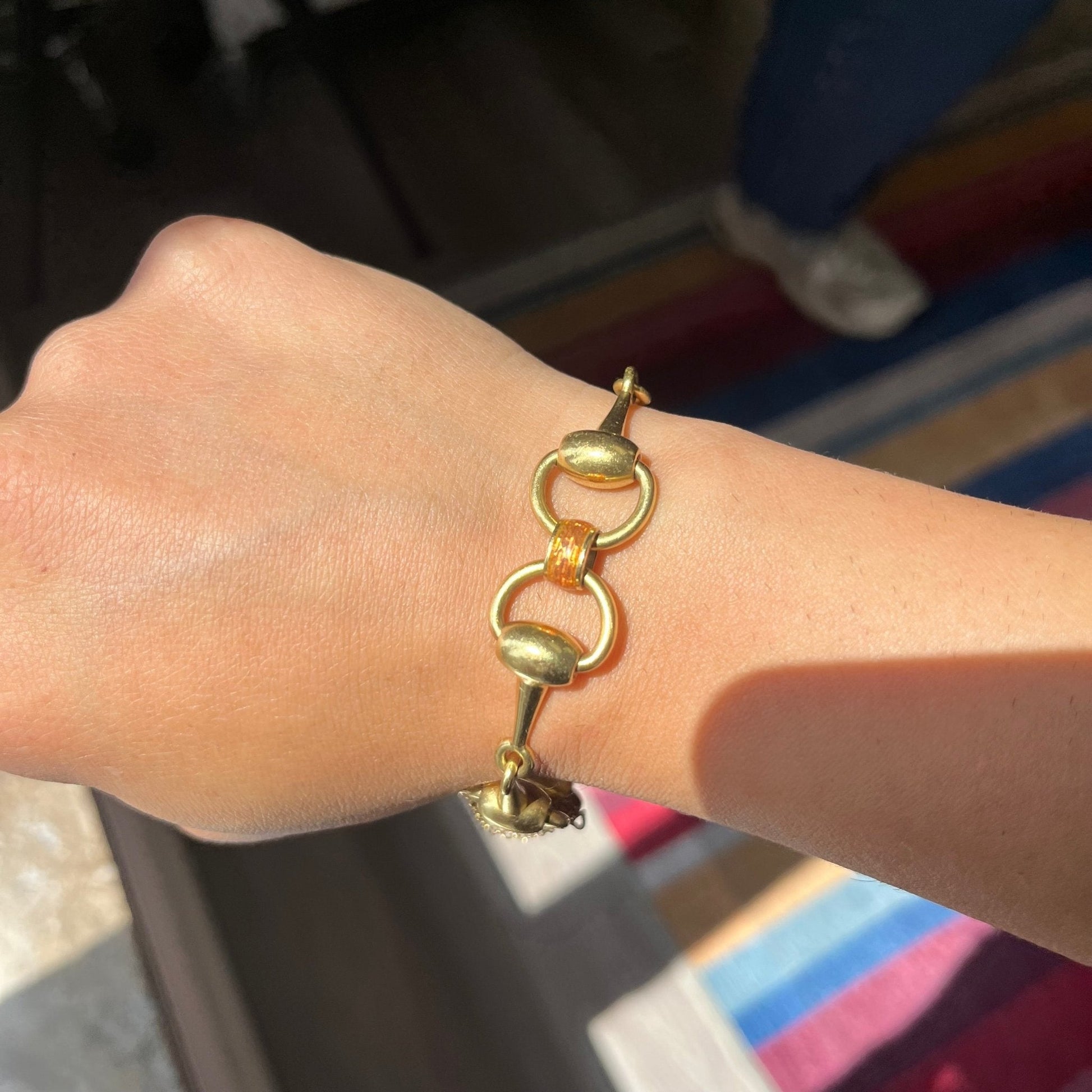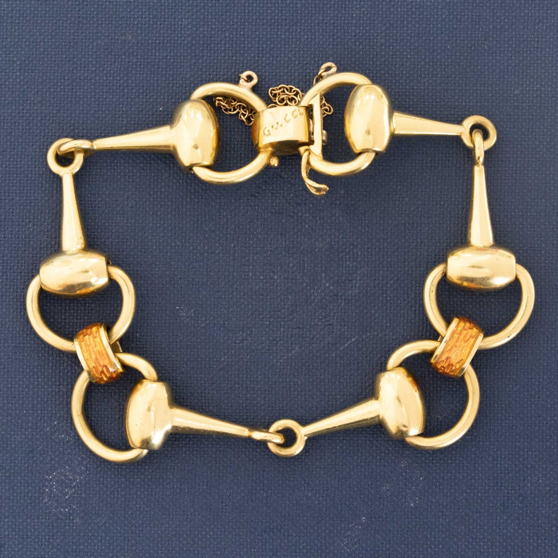 We've come across a few of these Gucci horsebit gold link bracelets, but none with enamel! The bold, elongated links span the wrist beautifully, with bits of crisp orange enamel peeking throughout. A chic wrist adornment that can only come to us from the old house of Gucci